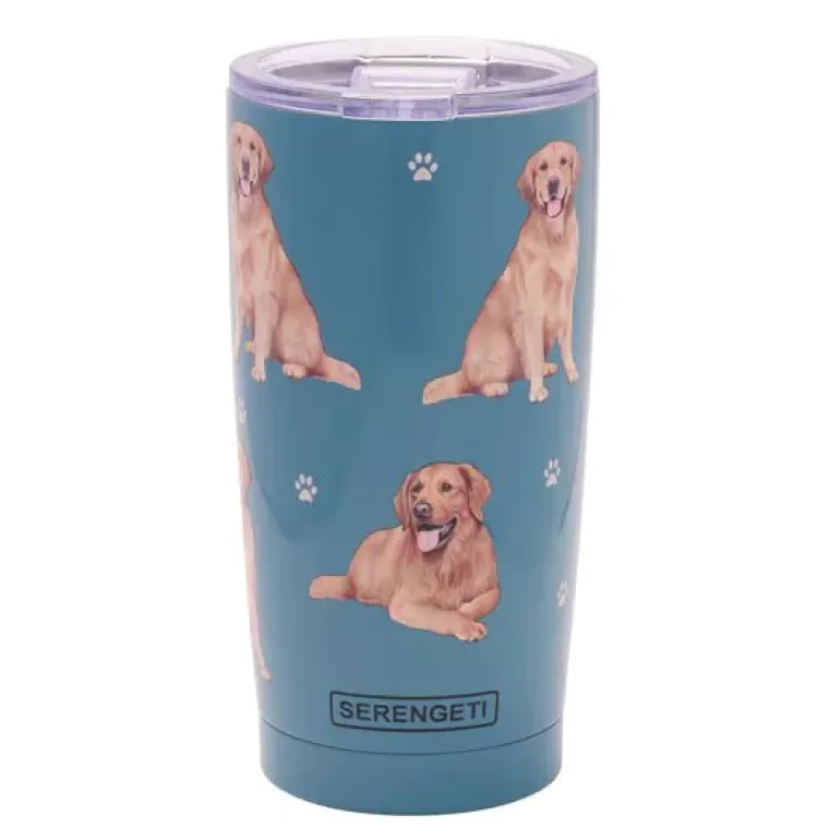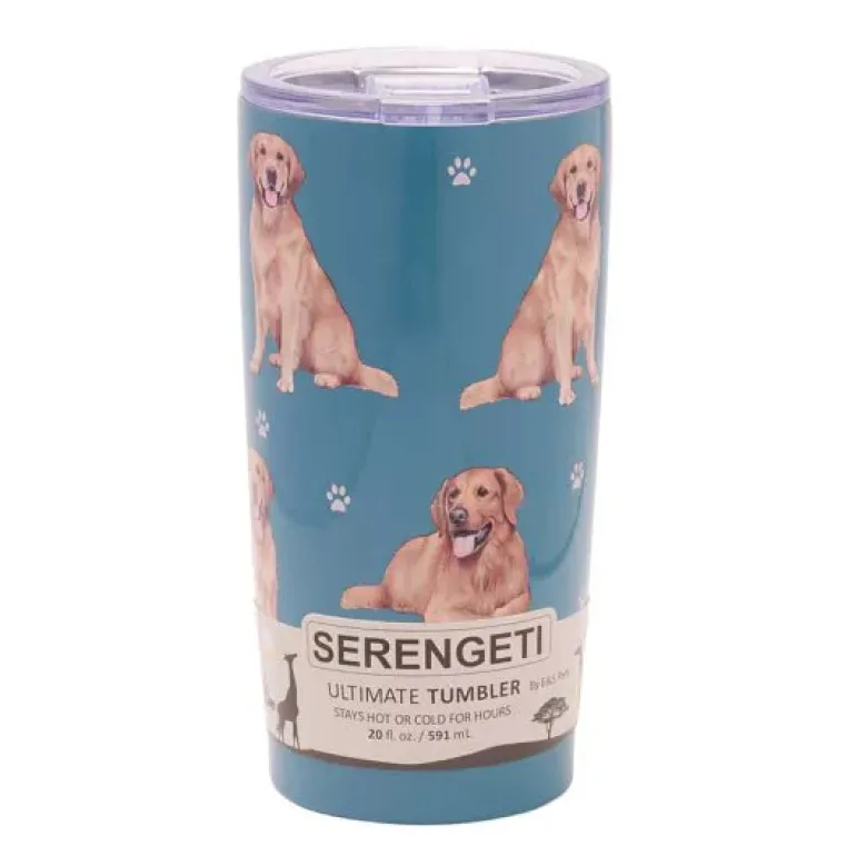 An E & S Pets Golden Retriever Serengeti Tumbler by Best of Breed. Ever wanted to stock a large tumbler where the contents stay hot or cold for hours? Well, now you can with this 591ml ultimate tumbler. With Golden Retriever images beautifully adorned around the outside, this is a must for all dog lovers. It features 3D German technology, is vacuum insulated, and has a spill proof lid. Ideal for when travelling or heading into work. Comes packaged with a card strip at the bottom.