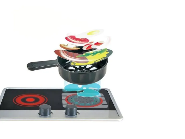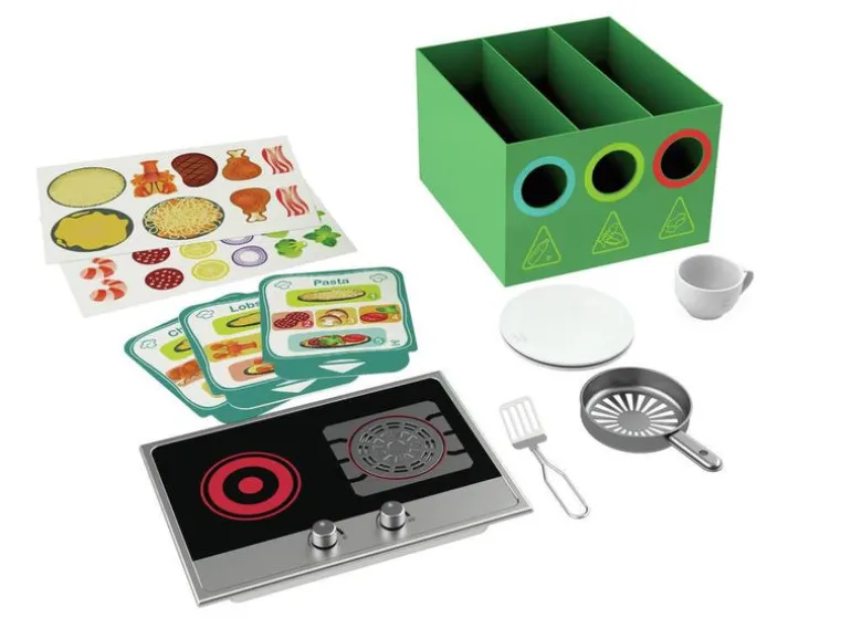 - Kitchen structure features a microwave, coffee maker, electric stove tops, sink with tap, oven, fridge and a recycle bin. The kitchen also includes one double-sided card of food shapes and one recipe book with six dishes. Accessories include a coffee cup, one plate, one pan and one spatula.