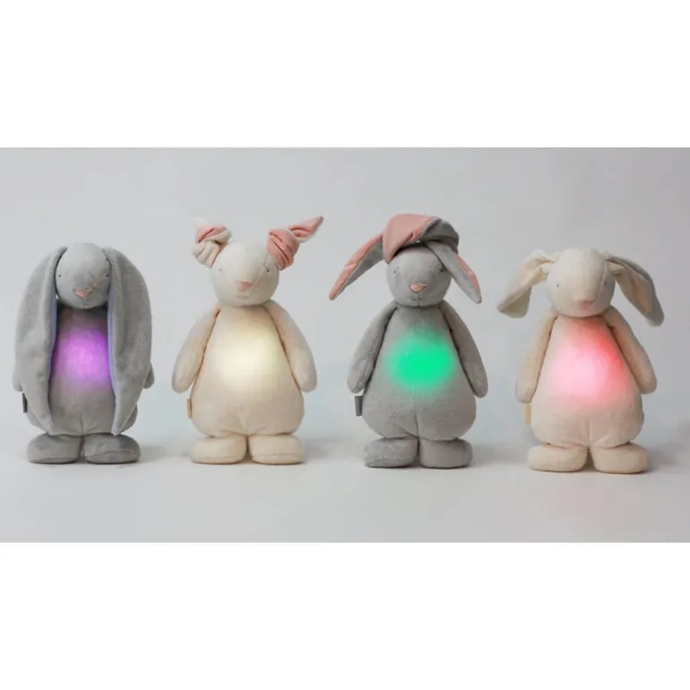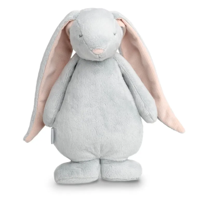 Grey and Pink Cloud Moonie Sound and Night Light Rabbit. With the long pink ears you can tie it up to a pram, stroller, cot or just for fun. The Moonie is really soft and light for baby to hold. Charged by USB and has a smart cry detector, plus it is easily washable.