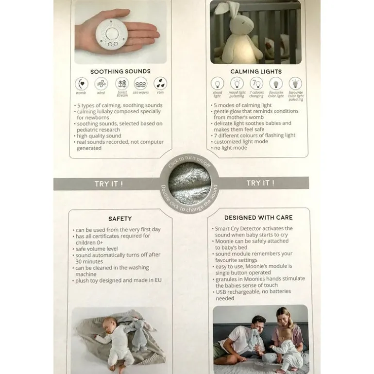 WASHABLE – unlike other white noise toys MOONIE features removable sound device that makes it easy to wash in a washing machine at 40 degrees.