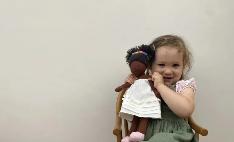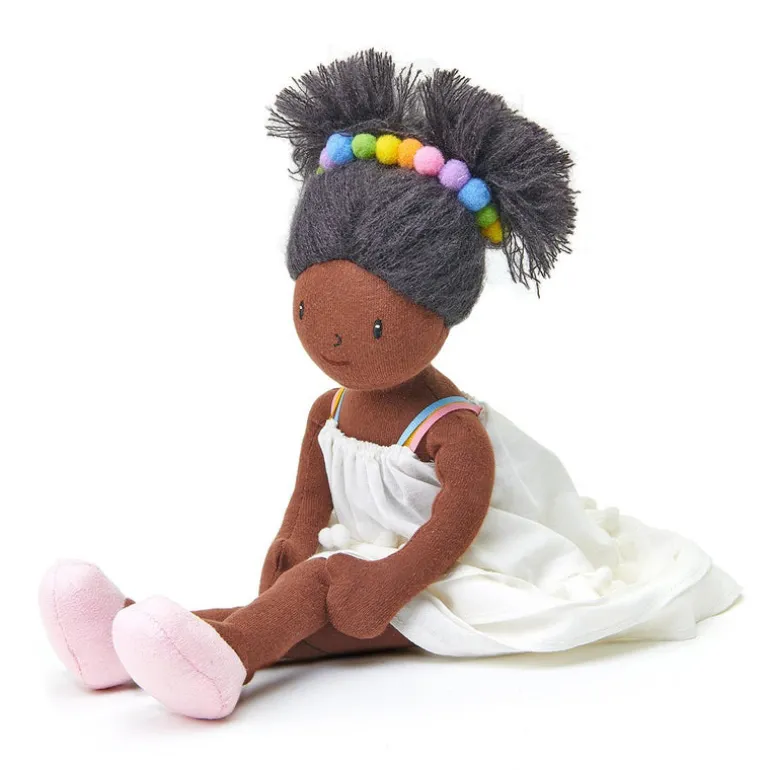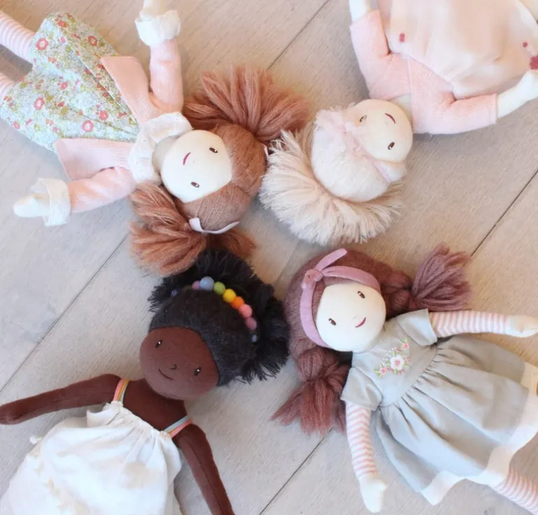 Made from the softest cotton jersey, each rag doll has their own unique character. With beautiful real wool hair, embroidered faces, pretty outfits and white pants, they are sure to become best friends. Presented on a printed backing card. They are also weighted in the bottom so they can sit easily on a shelf.