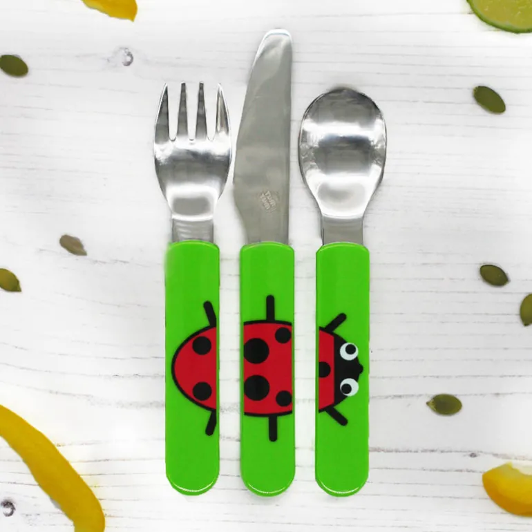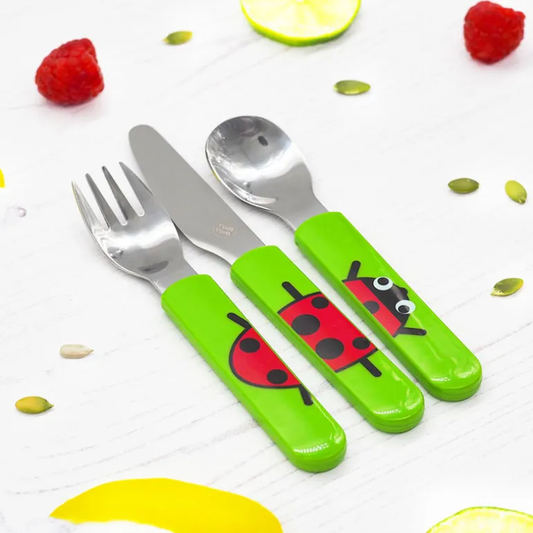 - Perfectly formed steel cutlery for teaching little ones how to feed themselves