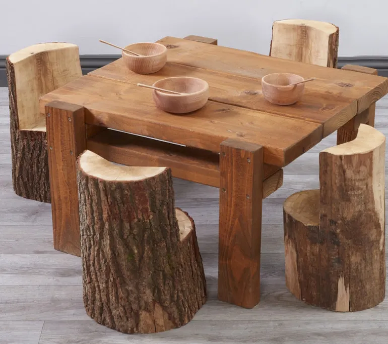 Mud cake and puddle tea anyone? Create a rustic café area in your outside role play or mud kitchen area with this set of 4 log seats and table.