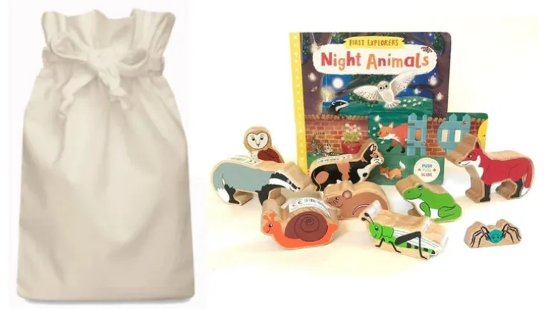 Night Animals Story Sack, full of animals that come out at night to explore. Lovely Colourful book from Campbell, First Explorer Night Animals board book. Pull the sliders to see all the animals hiding, match them with the wooden Lanka Kade animals, great storytime fun.