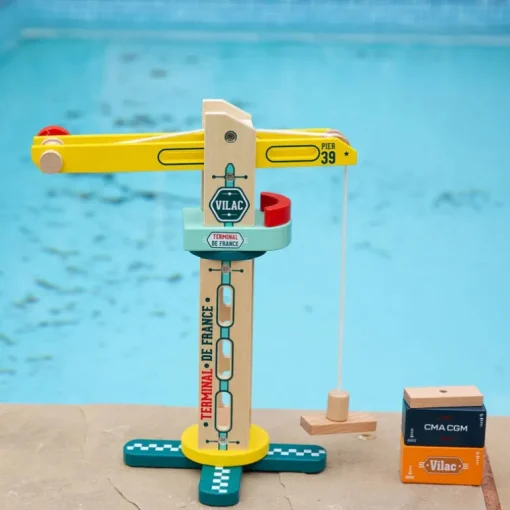 This fun, colourful wooden crane from Vilac will provide hours of entertainment for young children – and their parents! It is fully rotatable with a winch and extendable boom and magnets to pick up the cargo pieces. Perfect to pair with the Jules Verne container ship for the full port experience.